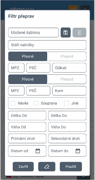 V okně nabídek vidíte základní údaje o nabídce. Jaké položky z nabídky se zobrazují, lze definovat v nastavení (3 tečky v pravém horním rohu). Kliknutím na šipku vedle místa Odkud a Kam se zobrazí další informace o nabídce. Kliknutím kamkoliv jinam na nabídce se zobrazí kompletní nabídka i se zadavatelem. Kliknutím na telefonní číslo u zadavatele můžete rovnou vytáčet.