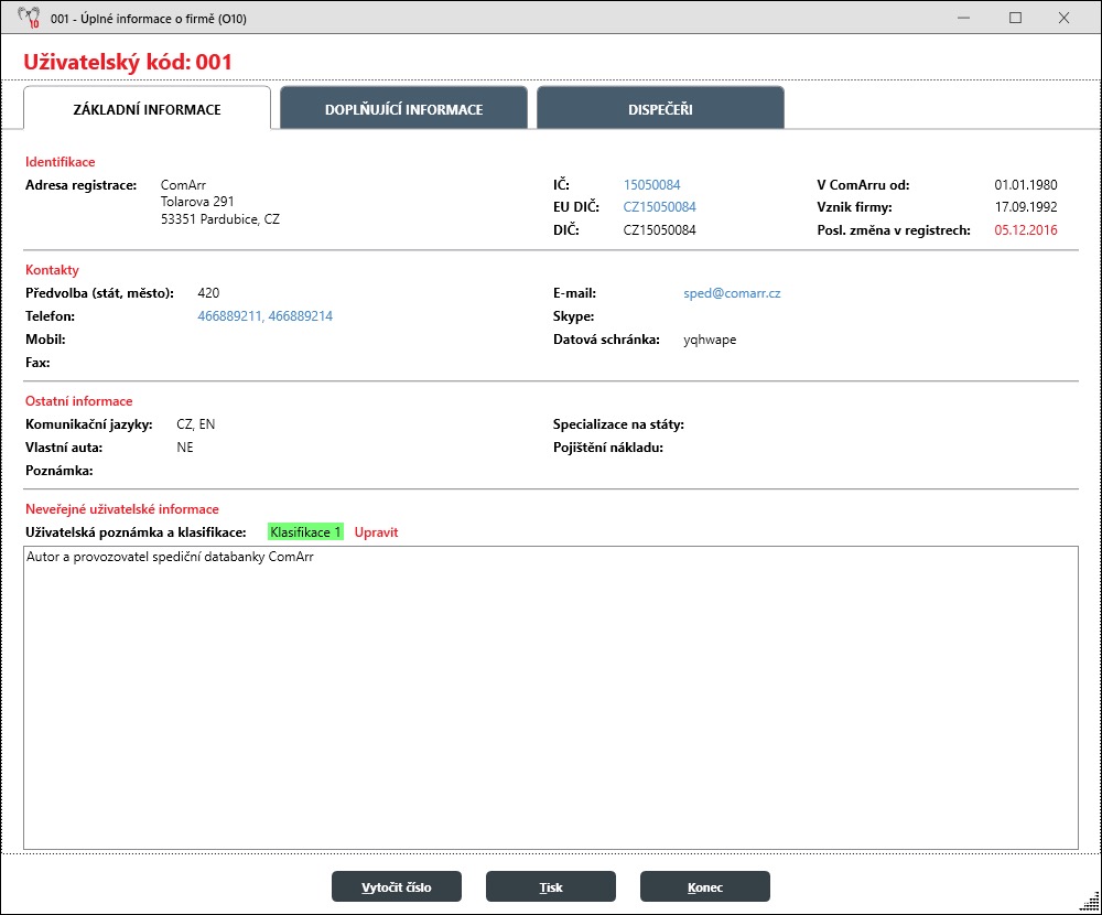 Informaci o zadavateli přepravy či volného auta se zobrazí v dolní části okna nebo dvojklikem myši na zvolené nabídce. Zobrazí se detailní informace o zadavateli (název firmy s adresou, registrační adresa firmy, telefony, email, IČ, DIČ, Skype jméno, …). K firmě si lze zapisovat různé poznámky, popř. si ji označit klasifikací 1 až 3. Nabídky takto označených firem pak budou podbarveny zeleně, žlutě nebo červeně. Můžete si například označit firmy, se kterými nechcete spolupracovat klasifikací 3. Jejich nabídky se pak podbarví červeně, popř. se jejich nabídky nebudou zobrazovat.
