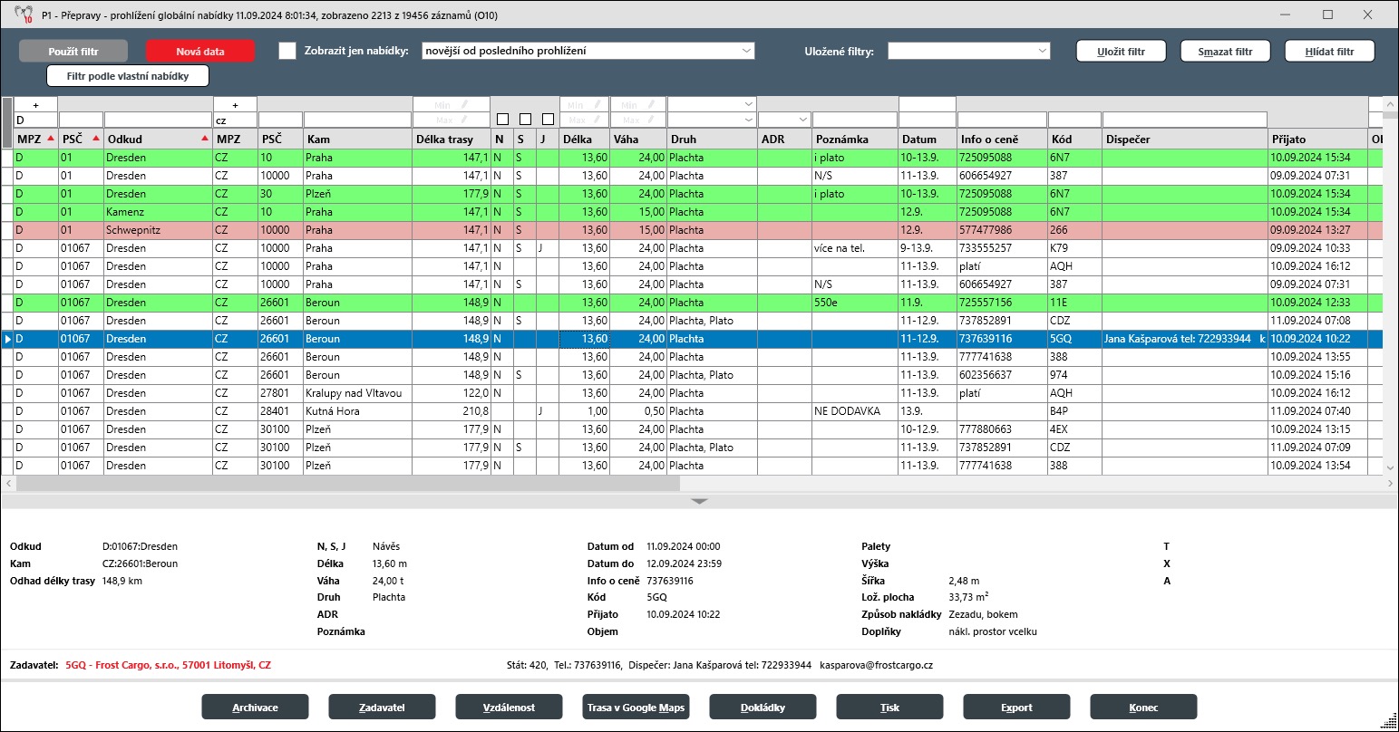 Prohlížení nabídek zadaných ostatními uživateli spediční databanky V části programu „Prohlížení“ si můžete zobrazit nabídky zadané ostatními účastníky spediční databanky. Nabídky lze dále filtrovat (např. nabídky pouze z Česka z „trojkové“ oblasti do Německa do „sedmičkové“ oblasti, délka nákladu do 3 metrů, hmotnost od 1 do 5 tun, popř. podle počtu palet, ADR, druhu nástavby, objemu, data,…). Tyto již vytvořené filtry si lze uložit pro pozdější využití. Toto je vhodné pokud hledáte více různých nabídek. Nabídky lze filtrovat i podle data vložení do spediční databanky, či zobrazit jen došlé nabídky od vašeho posledního prohlížení.