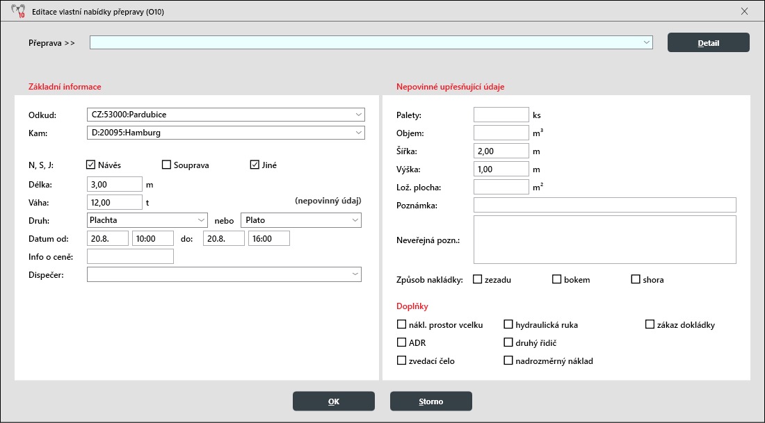 Zadání vlastní nabídky přepravy nebo auta lze provést buď v tabulkovém editoru, nebo přes detailní formulář. Zadávací formulář lze nastavit tak, aby vyhovovala vašim požadavkům. Lze si zvolit, které sloupce s údaji o nabídce se mají zobrazit, jejich pořadí i velikost.